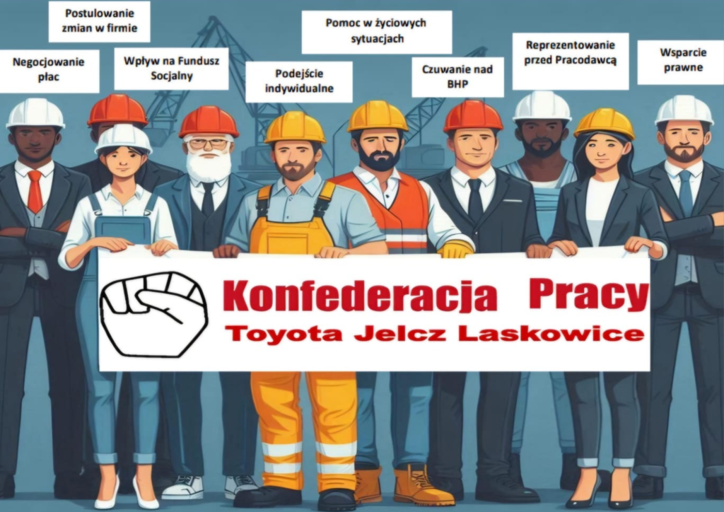 Administratorem danych jest ZARZĄD OGÓLNOPOLSKIEGO PRACOWNICZEGO ZWIĄZKU ZAWODOWEGO KONFEDERACJA PRACY PRZY TOYOTA MOTOR INDUSTRIES POLAND SP. Z O. O. z siedzibą przy ul. Japońska 6, 55 – 200 Łęg, gmina Jelcz – Laskowice (REGON: 022492345 , NIP: 912 – 187 – 54 – 00). Z administratorem możesz skontaktować się za pośrednictwem niniejszej strony internetowej lub pisząc na adres e - mail: kpracy.tmmpj@gmail.com i w dowolnym momencie wyrazić swój sprzeciw wobec przetwarzania Twoich danych osobowych.